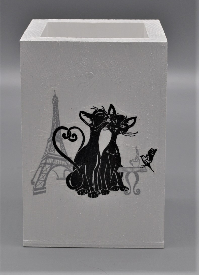 Dřevěný stojánek s motivem kočky. Můžete jej použít jako stojánek na tužky, v koupelně na hřebeny, v kuchyni na příbory a vařečky. Stojánek je zdoben metodou decoupage a přelakovaný, můžete otírat vlhkým hadříkem včetně motivu, ten je pečlivě zalakován.