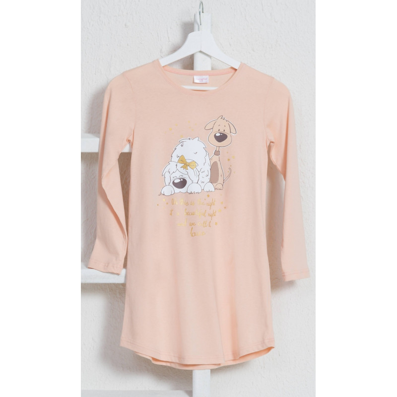 Dětská noční košilka mírně asymetrického střihu s dlouhým rukávem má na hrudi obrázek dvou roztomile odpočívajících pejsků obklopených hvězdičkami, pod kterými je stříbrně vyvedený nápis v angličtině - Oh, this is the night,it´s a beautiful night, and we call it love. Použitý materiál je jemný a poddajný na dotek. Košile je vhodná i na denní nošení.