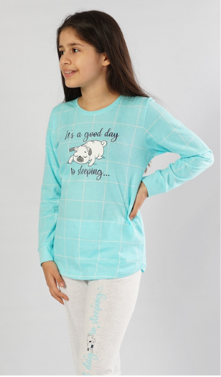 Dětské pyžamo se skládá z trička s dlouhým rukávem a dlouhých kalhot. Na triku s károvaným podkladem je spící pejsek Buldoček, kolem kterého je nápis 'It´s a good day to sleeping'. Stejný motiv se opakuje i na kalhotách, které jsou zakončeny panty. Použitý materiál je jemný a poddajný na dotek. Pyžamo je vhodné i na denní nošení.