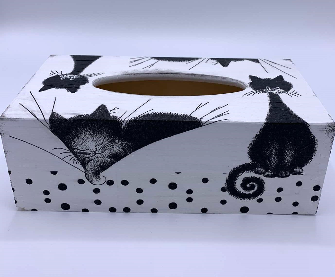 Krabička na kapesníčky je vyrobena z jehličnatého dřeva - borovice, jedle. Papírová krabička s kapeníky se vkládá zespod výsuvným dnem. vyrobeno metodou decoupage, 3x přelakováno nezávadným lakem. Motiv kočičky a spícího kotěte je z obou stran.