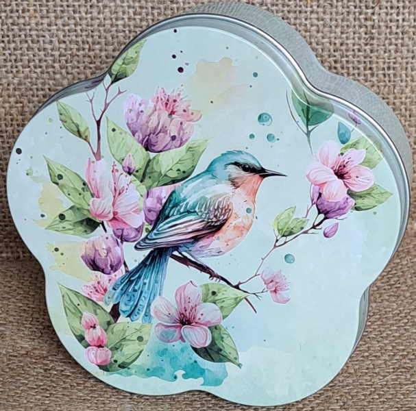 Plechová dóza ve tvaru květiny na drobnosti nebo bonbóny, suché potraviny s motivem ptáčka.