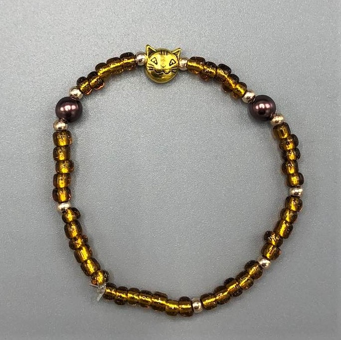 Originální náramek z korálků hnědé jantarové barvy s korálkem kočky.