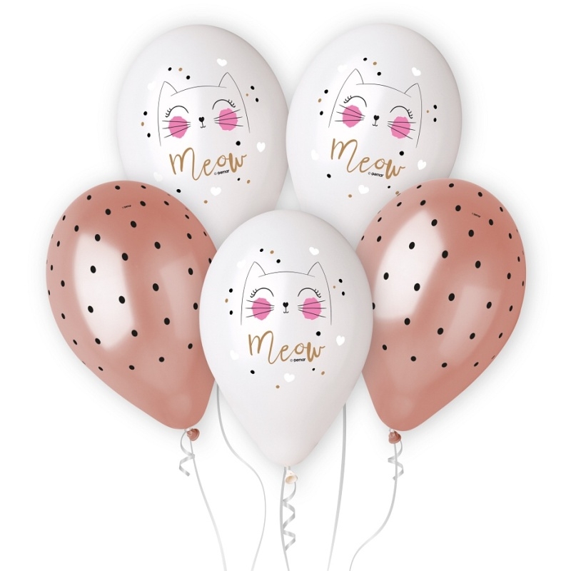 Pět nafukovacích latexových balónků na Vaši párty. Tři balónky jsou smetanové barvy s kočičkou a nápisem Meow, dva balónky jsou hnědorůžové s puntíky. Balónky nafouknete až do 33 cm. Můžete nafukovat vzduchem i heliem, vyrobeny jsou z přírodního latexu.
