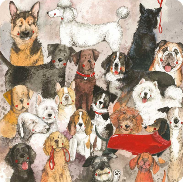 Korková podložka pod hrnek nebo skleničku s motivem různých pejsků, autorkou je anglická malířka Alex Clark.