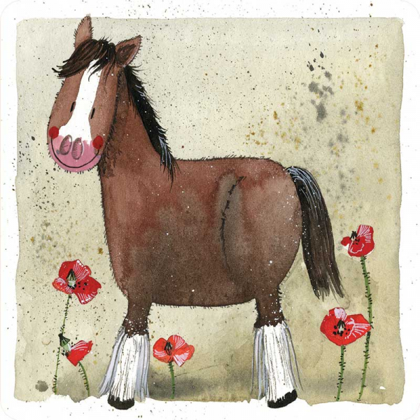 Korková podložka pod hrnek nebo skleničku s motivem koníka, autorkou je anglická malířka Alex Clark.