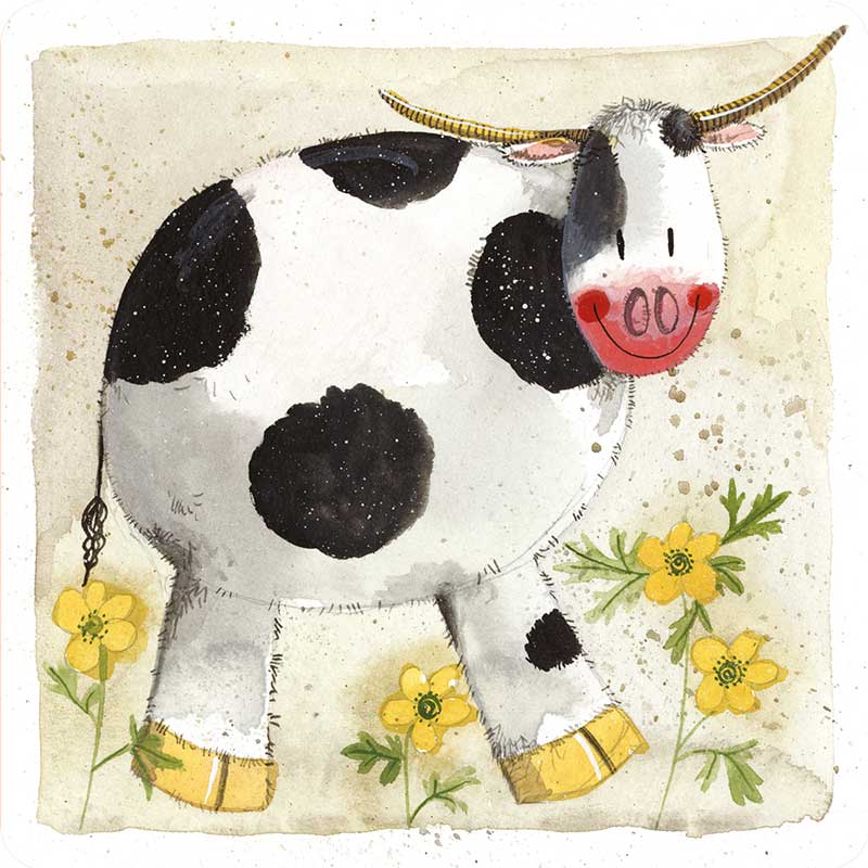 Korková podložka pod hrnek nebo skleničku s motivem kravičky, autorkou je anglická malířka Alex Clark.