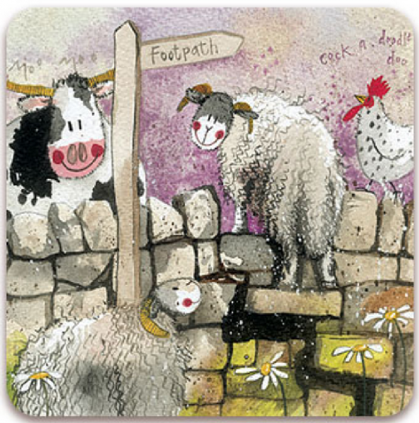 Korková podložka pod hrnek nebo skleničku s motivem oveček, kravičky a kohouta , autorkou je anglická malířka Alex Clark.
