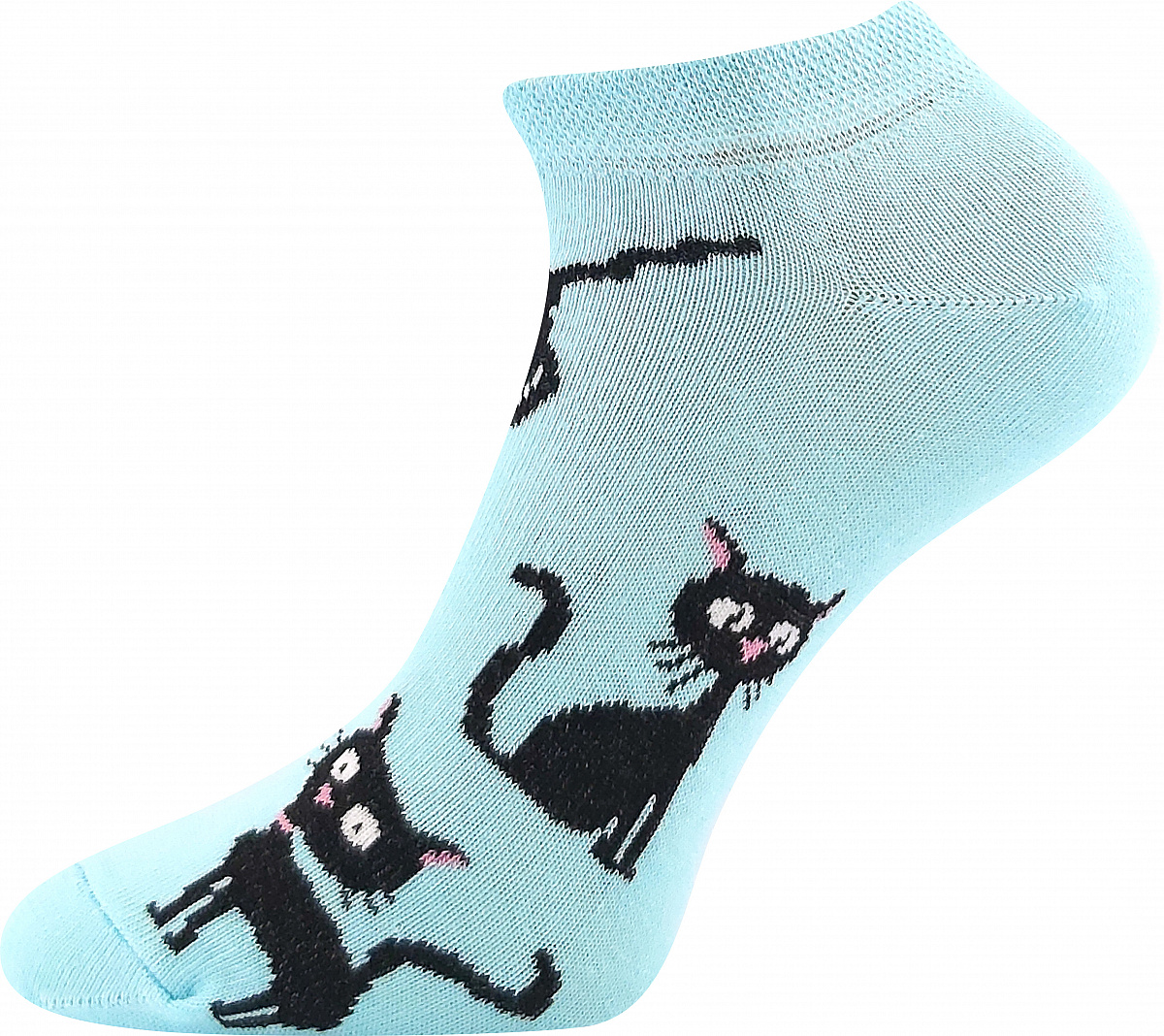 Moderní, krátké veselé ponožky s kočičkami z přírodního vlákna s příjemným omakem a vysokou schopností pojmout vlhkost. Lem ponožek sahá pod kotník.