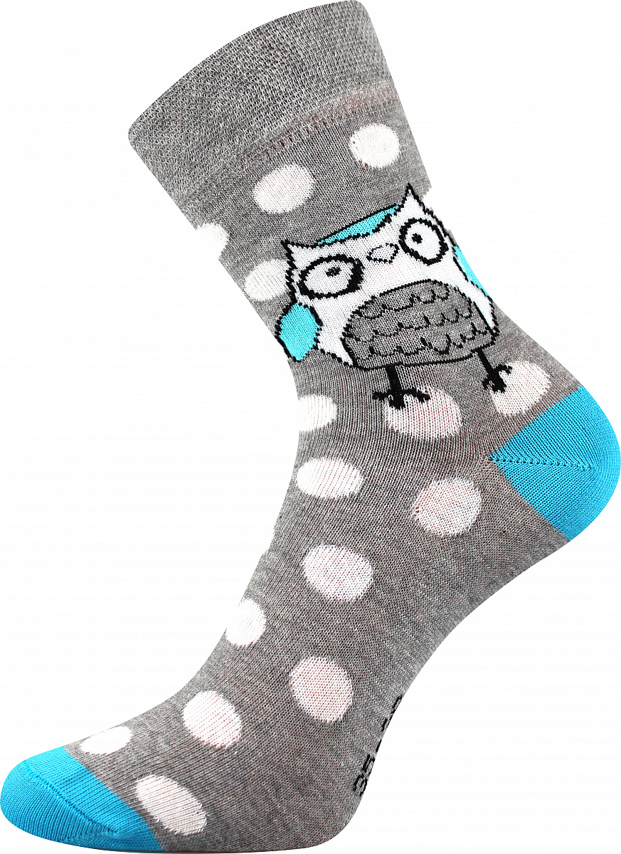 Moderní, veselé ponožky se sovou a puntíky. Ponožky z přírodního vlákna, příjemné na omak s vysokou schopností pojmout vlhkost. Vyšší podíl bavlny je doplněný o 5% elastanu, takže ponožka je příjemná na pokožce, ale zároveň je pružná a dobře drží tvar. Lem ponožek je jemný, nohu nestahuje.