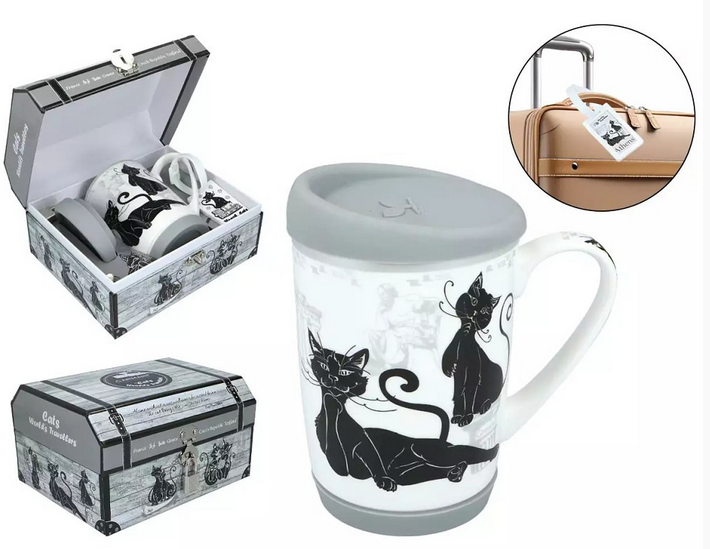Porcelánový cestovní hrnek se silikonovým víčkem a podstavcem, aby hrnek držel na různém povrchu. Na krabičce je malý kovový visací zámek. V sadě je plastová visačka na jméno. Krásný dárek pro milovnice koček a cestování.