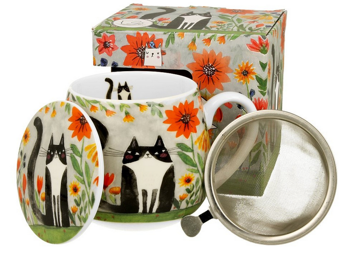 Hrnek z kvalitního porcelánu se sítkem a víčkem s motivem kočky na louce o obsahu 430 ml. Hrnek je vhodný do myčky i do mikrovlnky.
