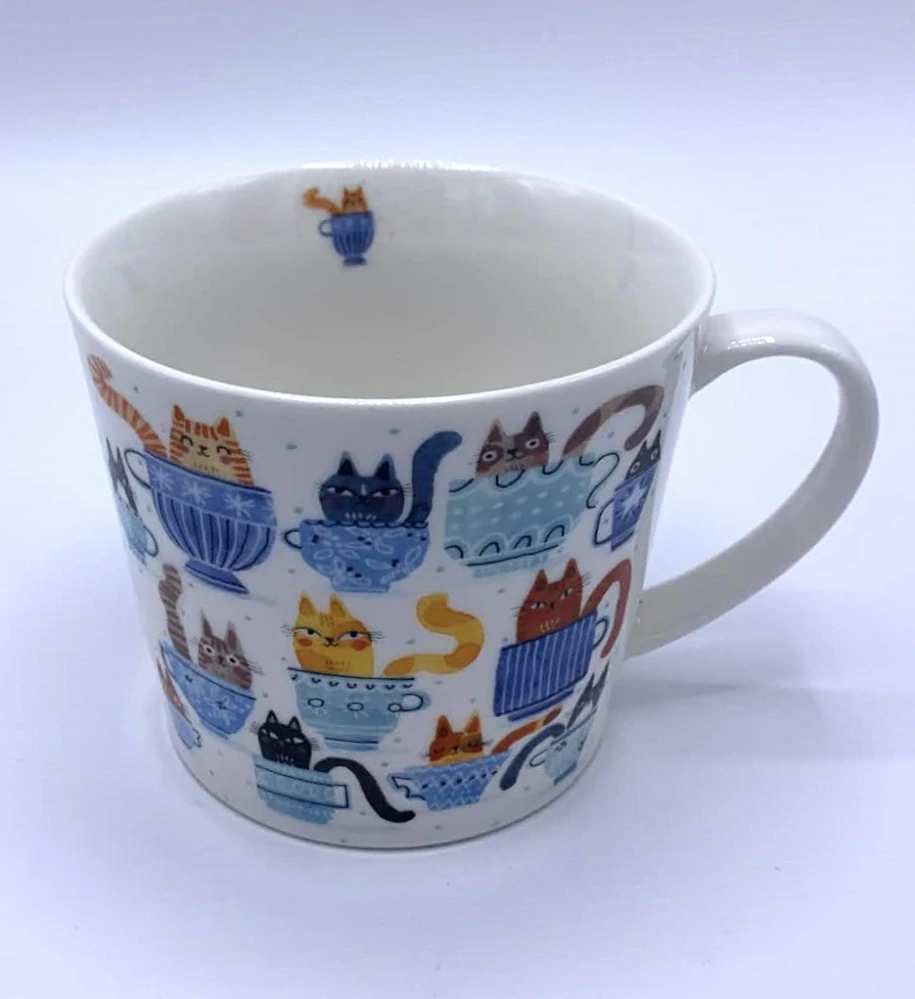 Hrnek z kvatního porcelánu s motivem koček v barevných hrníčcích o obsahu 610 ml. Hrníček je vhodný do myčky i do mikrovlnky.