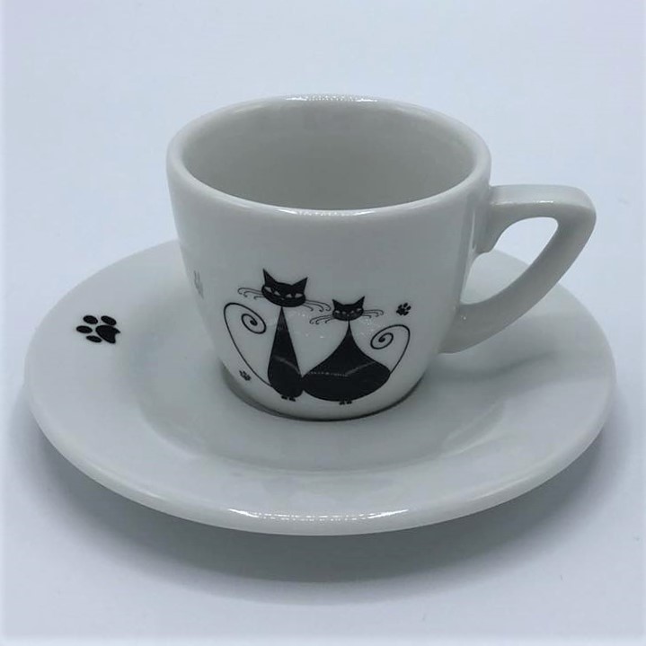 Krásný porcelánový šálek s podšálkem na espresso s oblíbenými černými motivy koček. Hrníček je vhodný pro mytí v myčce na nádobí i do mikrovlnné trouby.