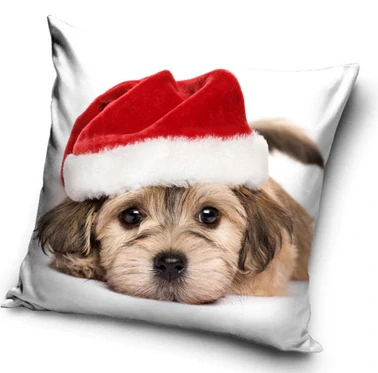 Dekorační povlak na polštář s motivem pejska ve vánoční čepici krásně dokreslí atmosféru Vánoc u Vás doma.