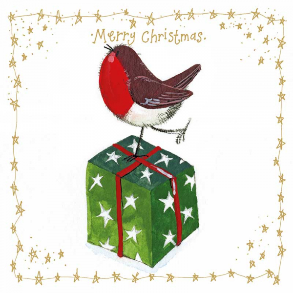 Přání s obálkou vánoční Robin and Present, ALEX CLARK 10*10 cmskladem 1 ks45 Kč/ ks