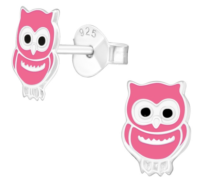 Roztomilé stříbrné náušnice ve tvaru růžové sovičky.