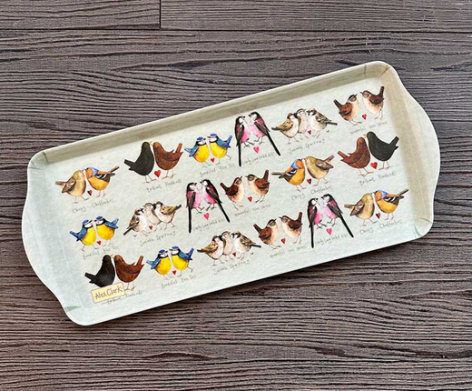 Melaminový tácek s motivem ptáčků. Autorkou je anglická malířka Alex Clark.