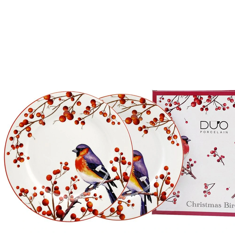 Dárkově balená sada dvou dezertních talířů.Vánoční motiv ptáčka a cesmíny. Baleno v ozdobné krabičce, vhodné do myčky i do mikrovlnky.
