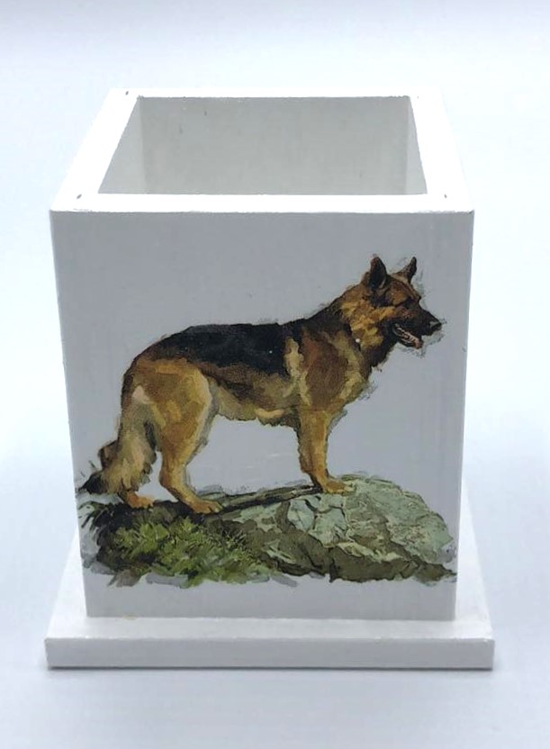 Dřevěný stojánek s motivem pejska rasy německého ovčáka. Můžete jej použít jako stojánek na tužky, v koupelně na hřebeny, v kuchyni na příbory a vařečky. Stojánek je zdoben metodou decoupage a přelakovaný, můžete otírat vlhkým hadříkem včetně motivu, ten je pečlivě zalakován.