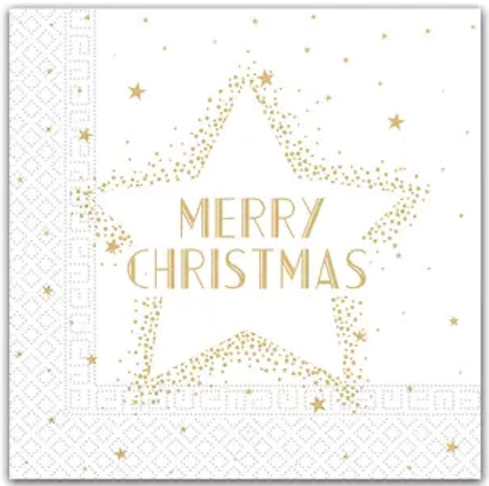 Ubrousky se zlatým nápisem Merry Christmas a hvězdičkami budou stylovou dekorací na vašem vánočním stole. Ubrousky jsou vhodné pro styk s potravinami, rovněž pro ubouskovou metodu.
